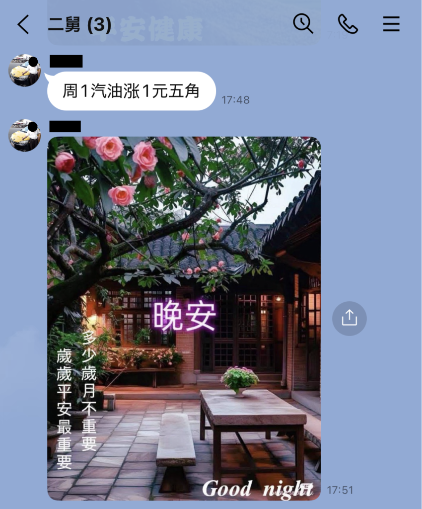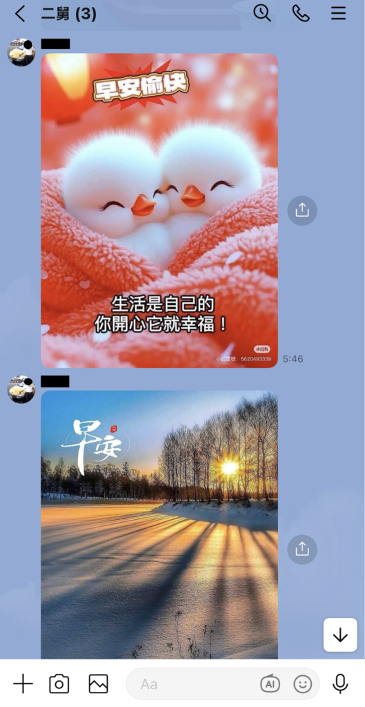 友人や親せき同士で朝晩のあいさつの画像を送り合っているようなので、その画像が転送されて私たちのグループLINEにも送られてくるのでしょう。
