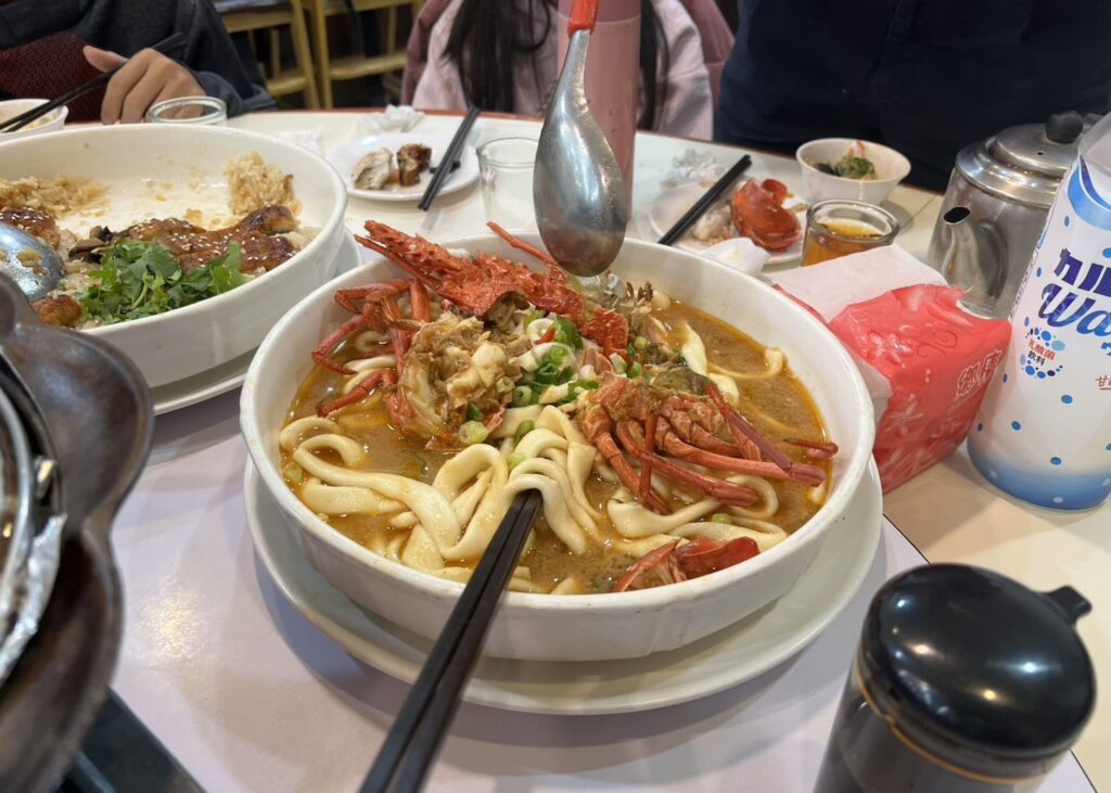 ロブスターの下にもの凄くモチモチとした太麺が敷かれたお料理、うなぎが乗ったおこわもとても美味しかったです。(大分食べてしまった後の写真)